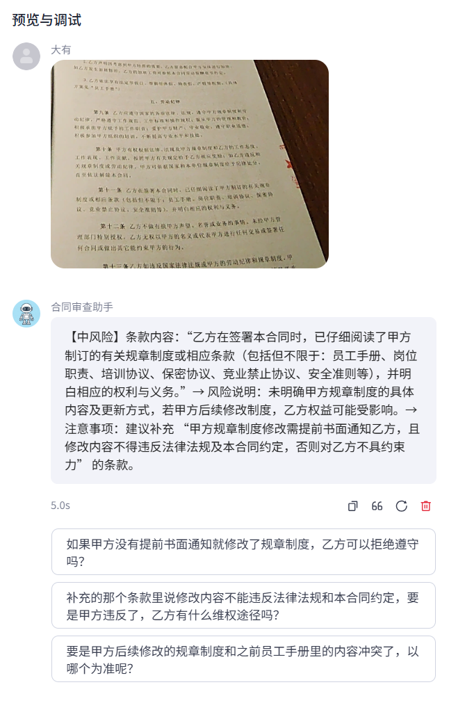 移动化、实时化操作:支持在会议现场、外出洽谈等非办公场景下,通过语音交互即时发起合同咨询,实现“即问即答”。