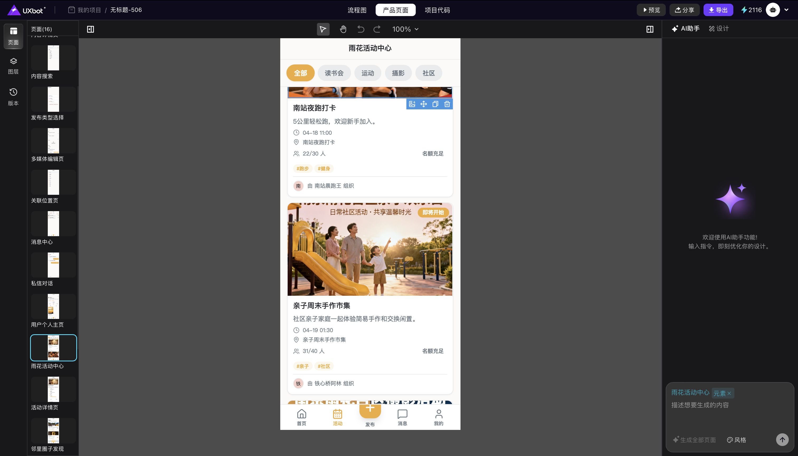 一次性生成完整多页面系统:输入内容社区的需求描述,UXbot可一次性生成10-15个核心页面,覆盖主功能流程,无需逐页反复提示逐步添加