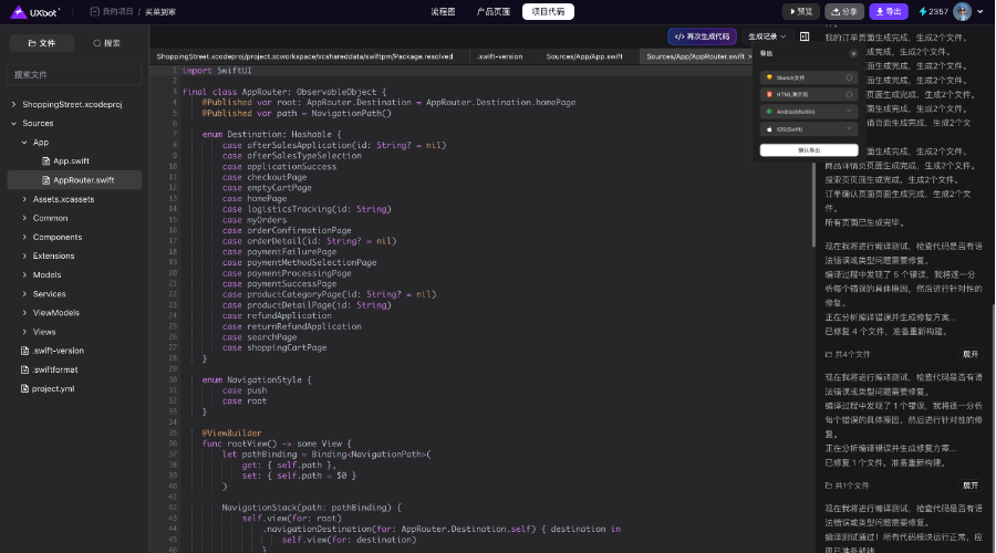 原生移动端代码生成:UXbot是目前唯一同时支持Android/Kotlin和iOS/Swift原生代码导出的AI工具,竞品仅支持Web或跨平台框架
