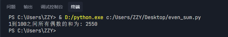 python even_sum.py,按下回车,终端会输出结果:“1-100之间所有偶数的和为:2550”;