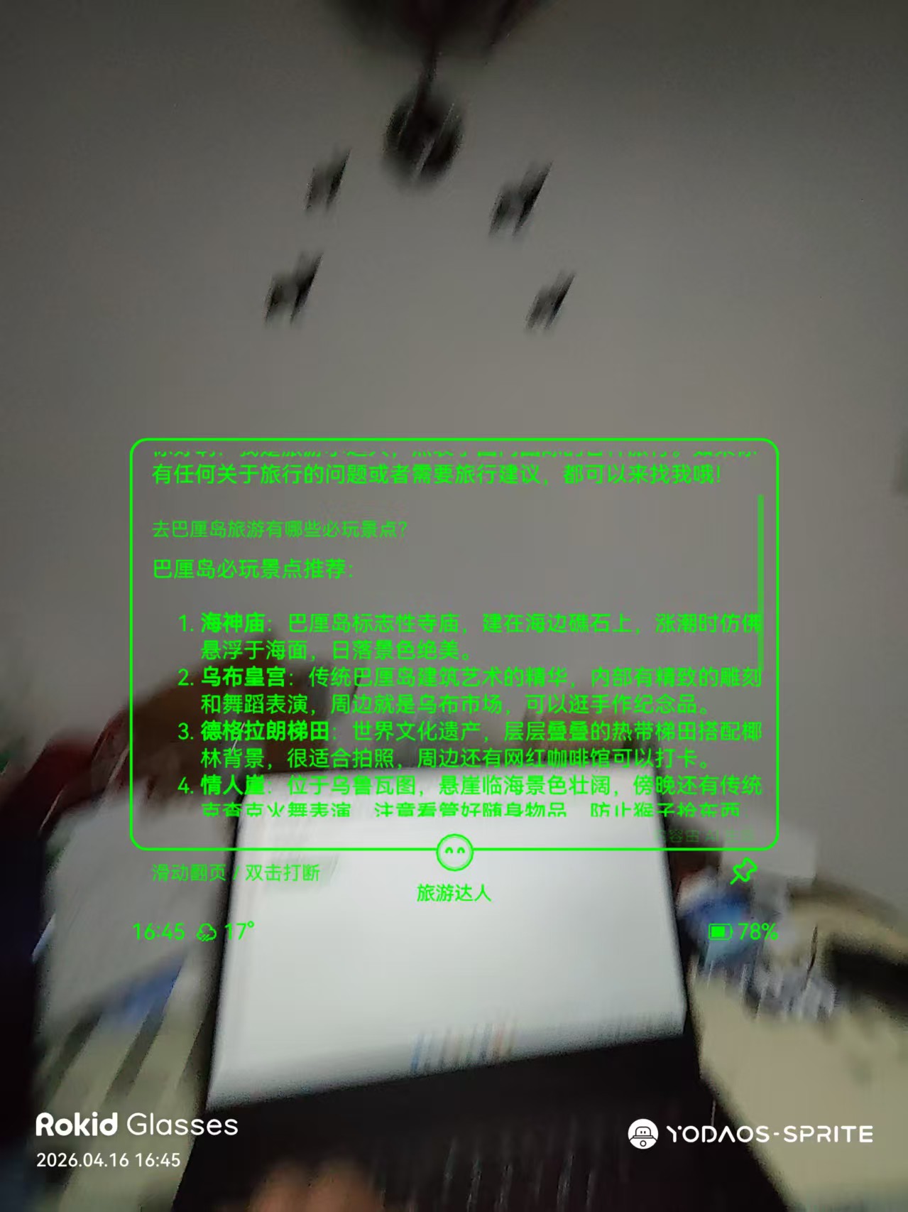 传统旅游中,用户频繁低头查攻略的痛点突出,Rokid Glasses凭借轻量化、语音交互、实时信息采集能力完美解决这一问题,结合“旅游达人”智能体,其核心价值体现在三方面:沉浸式交互无需中断游览,实时场景适配可提供贴合当下的建议,轻量化设计实现“解放双手”。