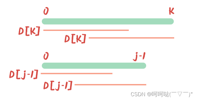 结合上图,D[j-1]:P[0]~P[j-1],前 j 个 字母拥有的最大公共前后缀的长度