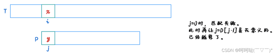 若 j = 0时,匹配失败。(极端例子)此时再让 j = D[j-1]是无意义的。已经越界了。那怎么办呢?