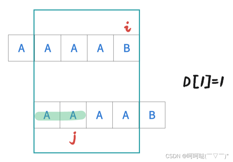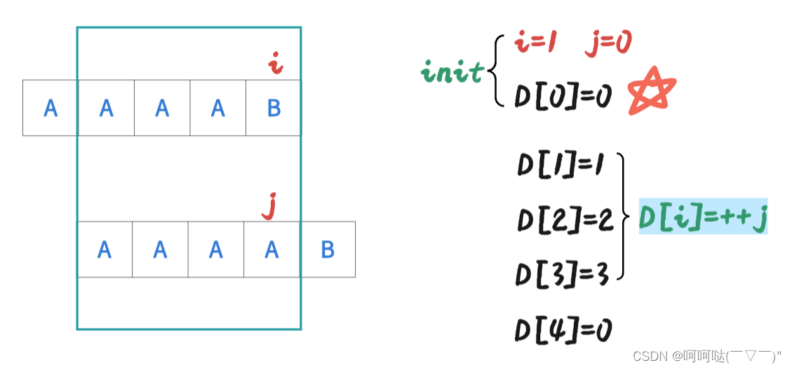 (1)若当前 j 所指的字符 恰好与 i 所指的字符相等,也就是图中的字符都为 x,此时 j 该更新了,j = 4,在图中表现为蓝色的 j 。那此时 D[i] = ++j;