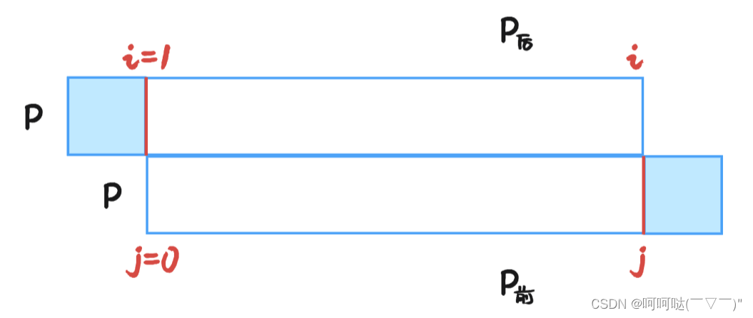 这里采用的方法是:把P串错开一个位置,上下都是P串。但是由于错开一个位置,最开始匹配的地方是i = 1 和 j = 0。那匹配到什么地方结束呢?此时 i 在P串的最后一个位置,j 在P串的倒数第二个位置。从图里可知上P串的第一个字符和下P串的最后一个字符没有参与匹配,这意味着对P串的后缀和P串的前缀去进行匹配判断,计算最大公共前后缀