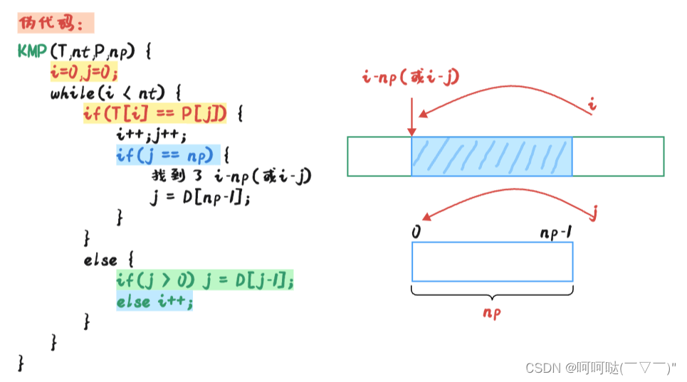 那就继续进行下一个字符的匹配判断,也就是i++,j++。如果说运气非常好,j == np了,说明找到了匹配结果。找到匹配起点位置:i - j
