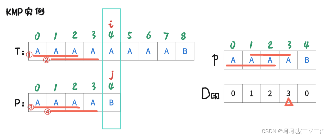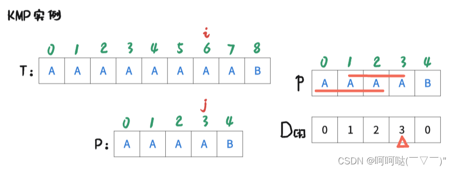 着重看 串② 和 串③,通过刚才观察最大前后缀的部分,我们可以发现串② 和 串③ 是相等的。也就是这三个A没必要进行比较了,直接跳过。此时操作:i 不变,让 j = 3,即:j = D[4-1] = 3; 再让T[i] 和 P[j] 去判断是否匹配。