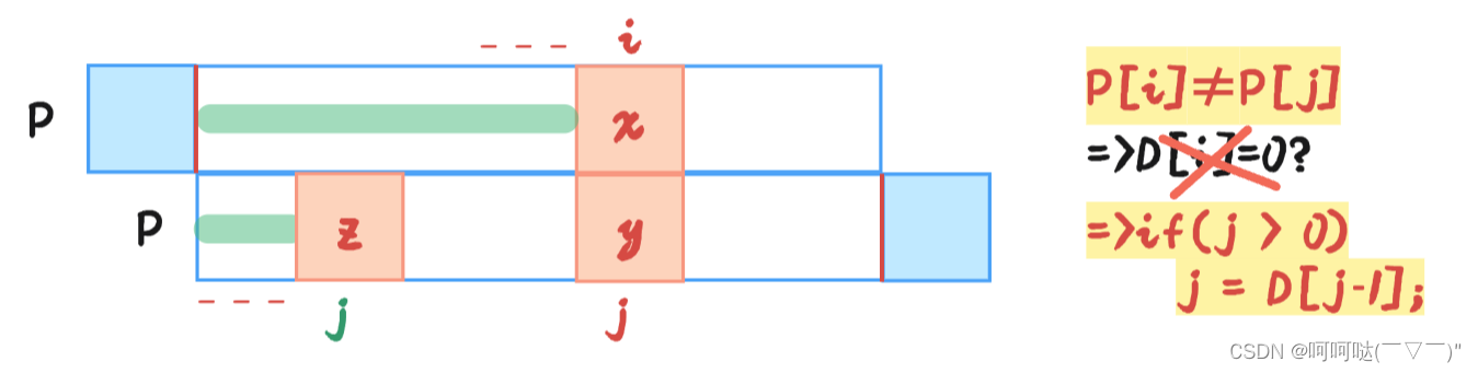 (2)若当前 j 所指的字符z 与 i 所指的字符x 不相等,就继续看下P串的绿色部分有没有公共前后缀,继续移动 j,移动到 当 j = 0的时候,匹配仍然失败,只能让i 移动了。