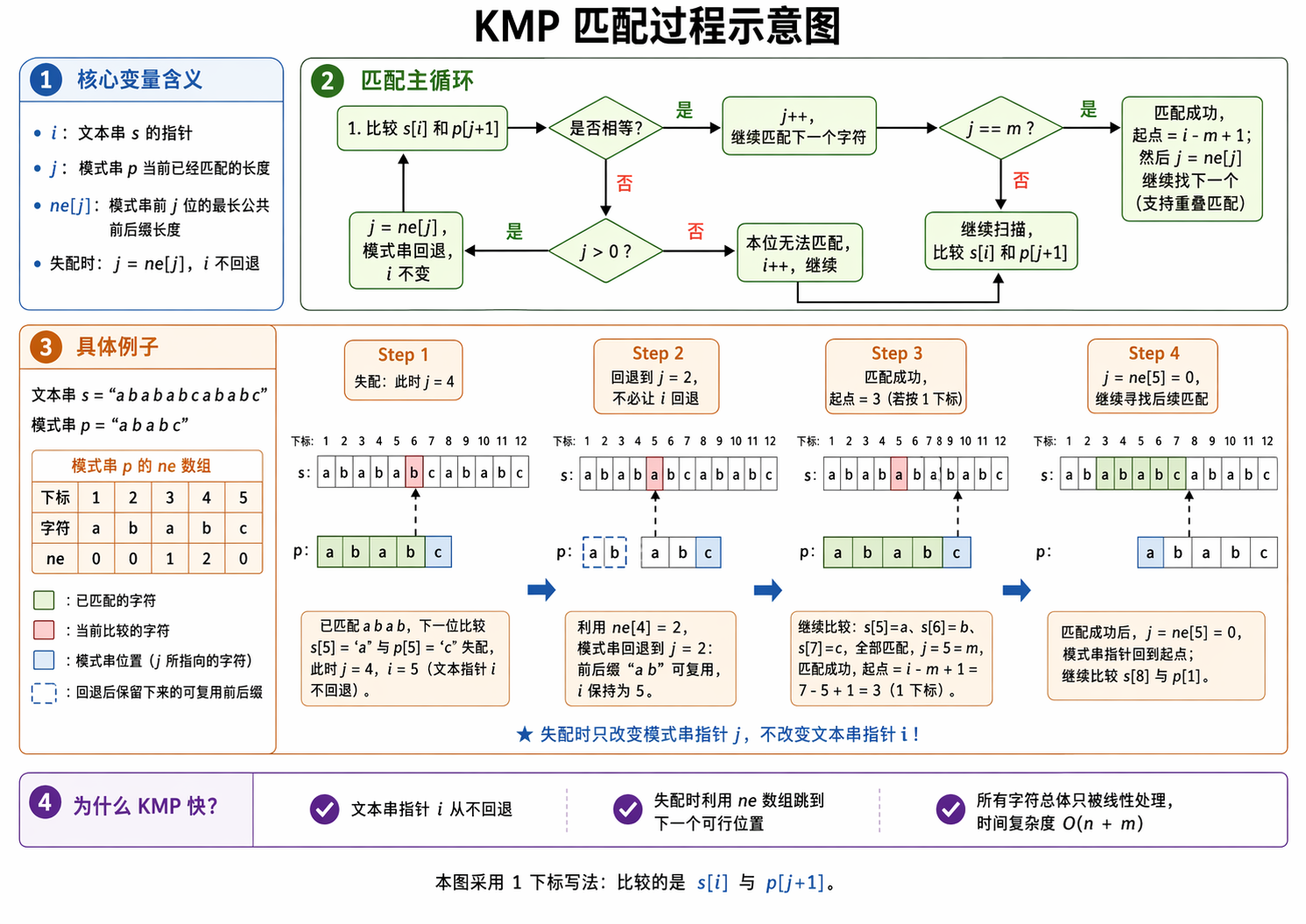 KMP(Knuth-Morris-Pratt)算法的精髓在于 利用模式串自身的结构信息,使得匹配失败时,主串指针 i i i 永不回退,模式串指针 j j j 智能回退。