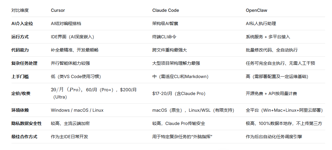 三款AI编程工具深度对决:Cursor、Claude Code与OpenClaw,谁才是你的“编程搭档”?